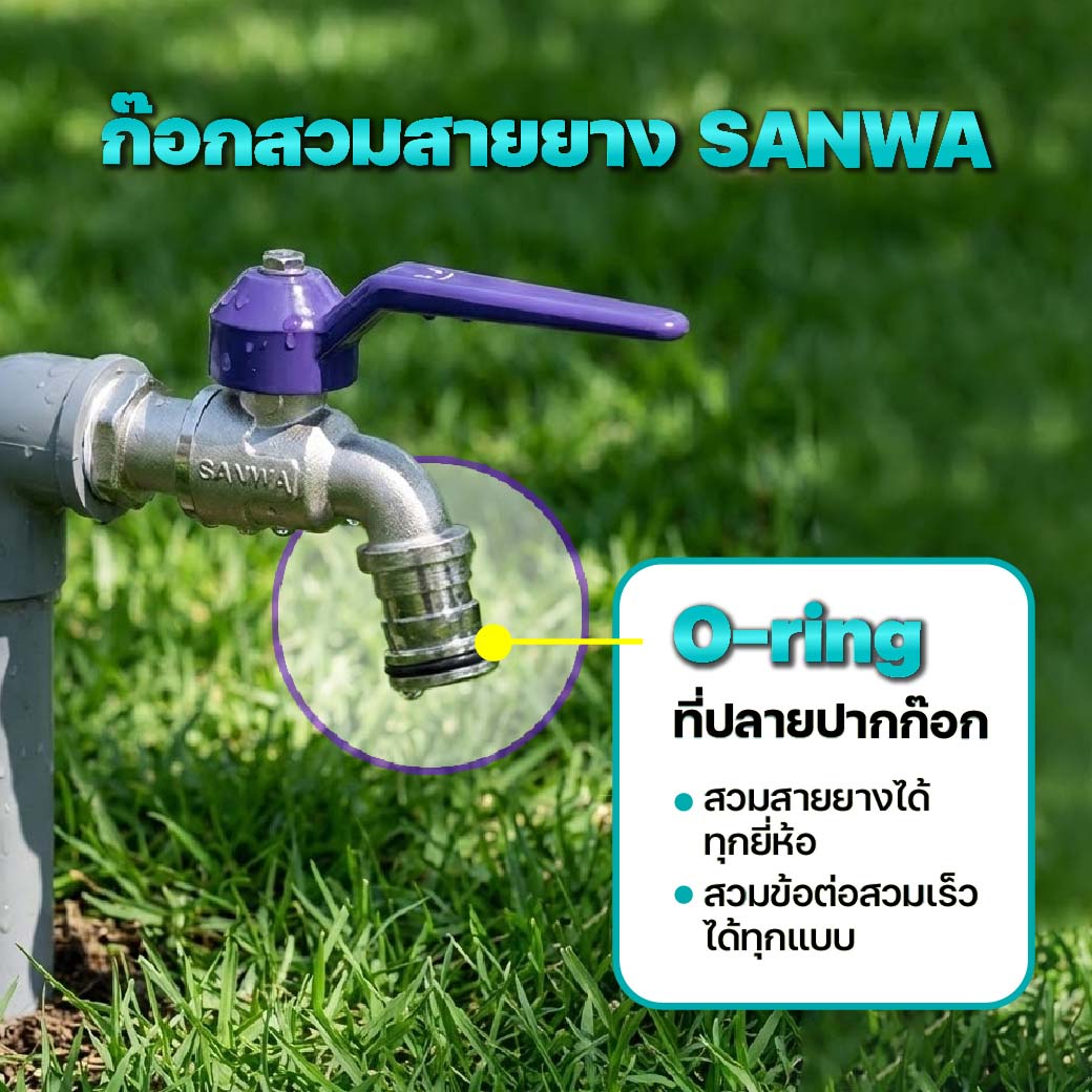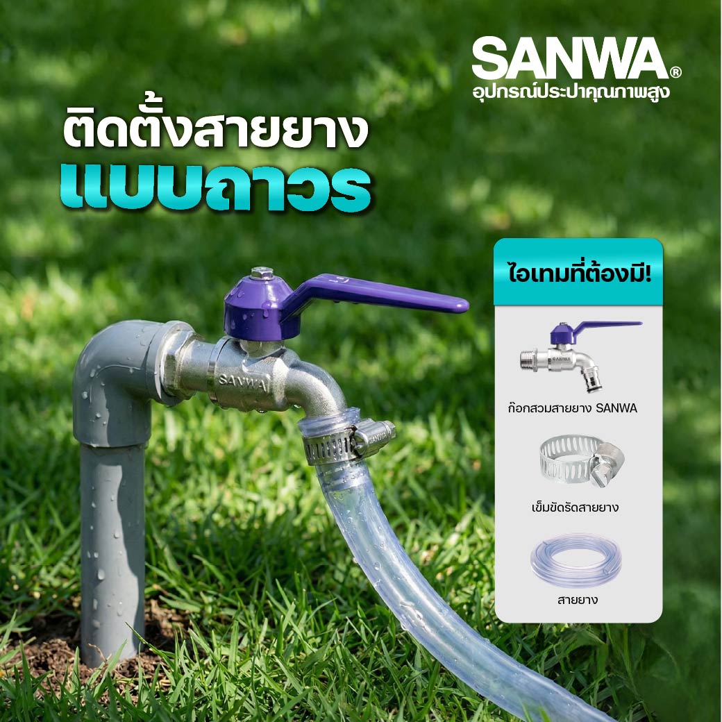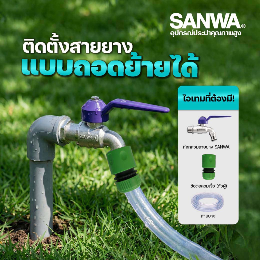 1. ก๊อกสวมสายยาง SANWA รุ่นนี้ปากก๊อกทำหน้าที่เป็นข้อต่อสวมเร็วแบบตัวผู้ ไม่จ้องซื้อเพิ่มก็ใช้ได้ทันที