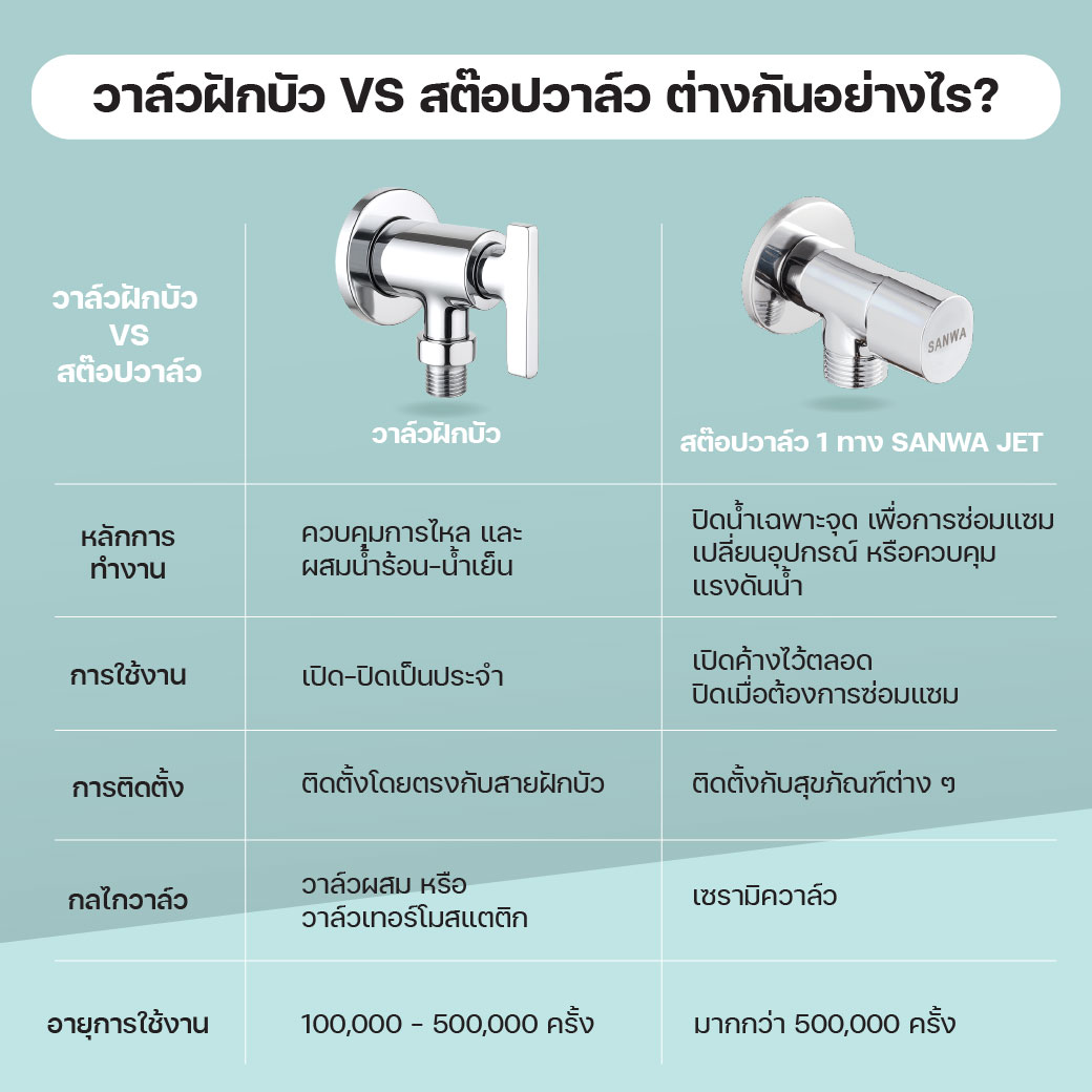 ตารางเปรียบเทียบการใช้งานและคุณสมบัติของวาล์วฝักบัว และ สต๊อปวาล์ว ต่างกันอย่างไร?