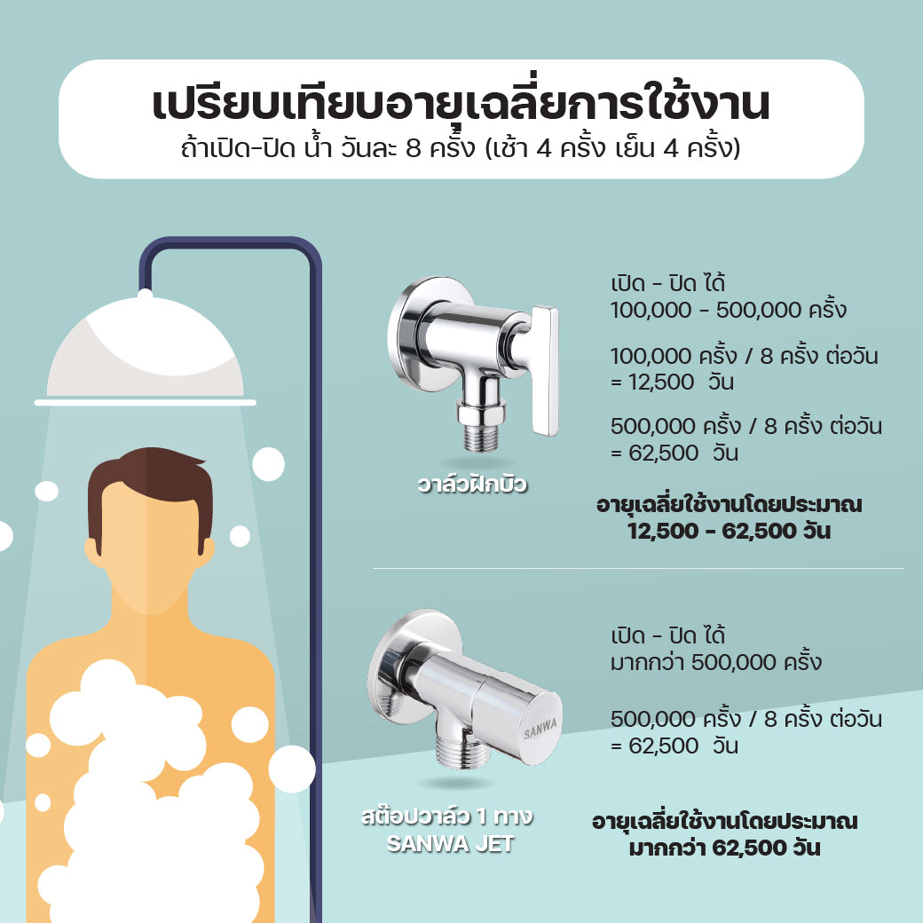เปรียบเทียบอายุเฉลี่ยการใช้งานระหว่าง วาล์วฝักบัว และ สต๊อปวาล์ว 1 ทาง SANWA JET